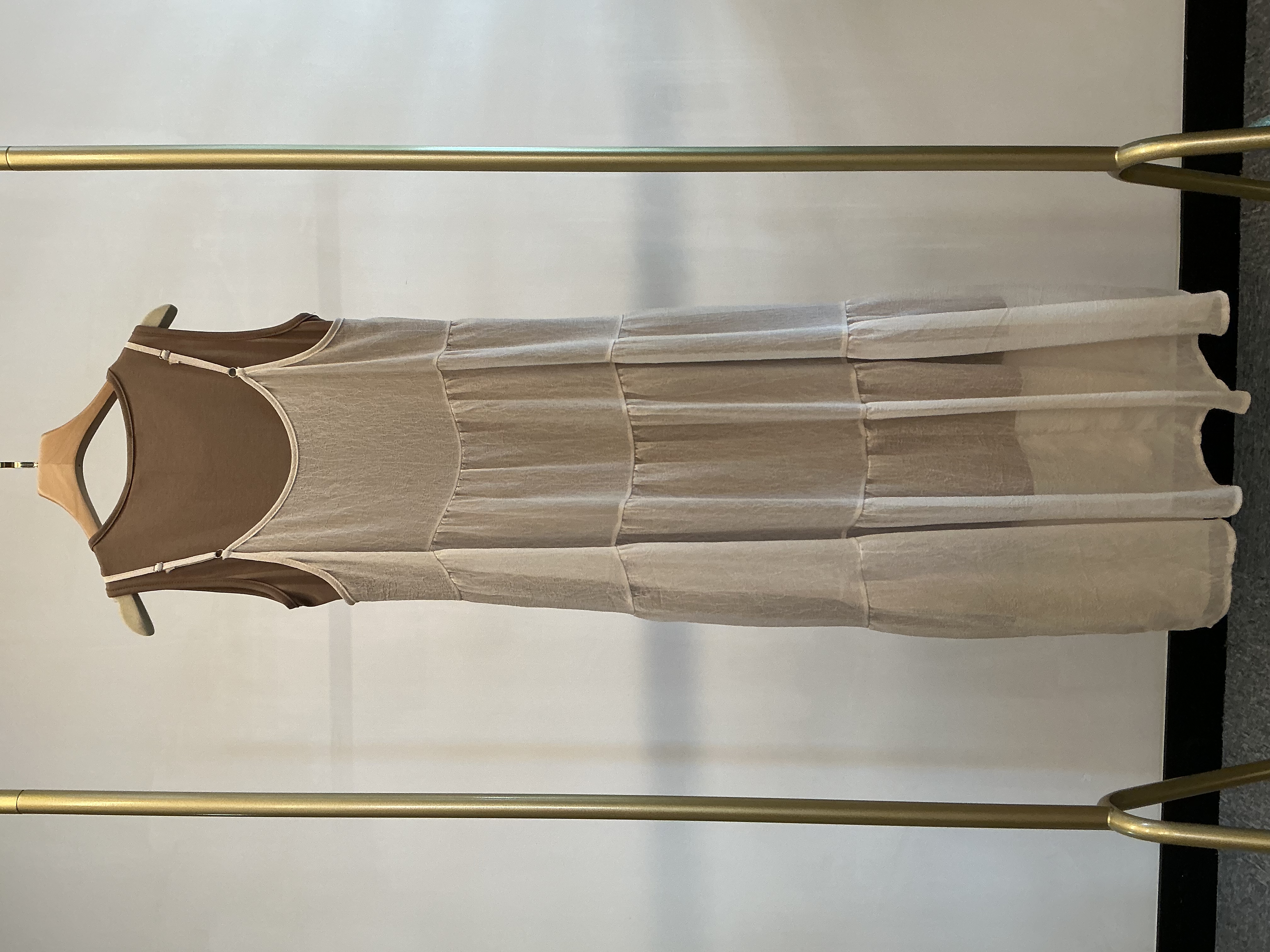 咖啡色配雪紡杏色吊帶連身長裙