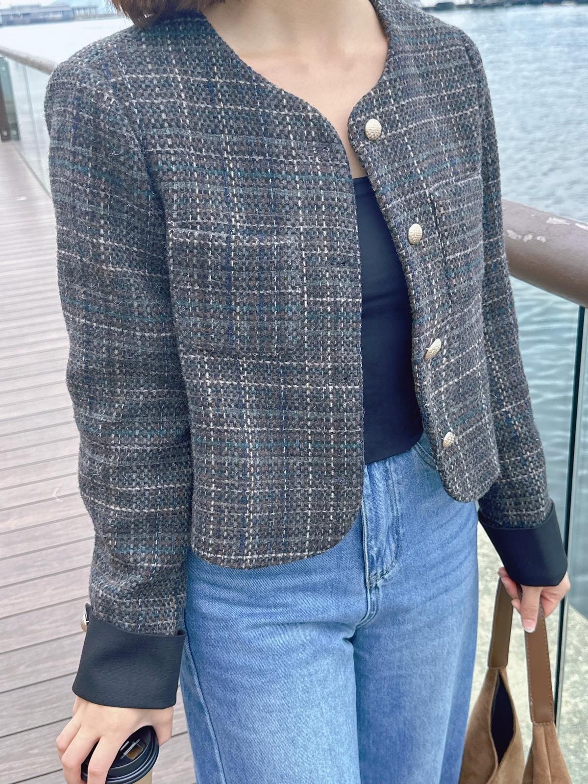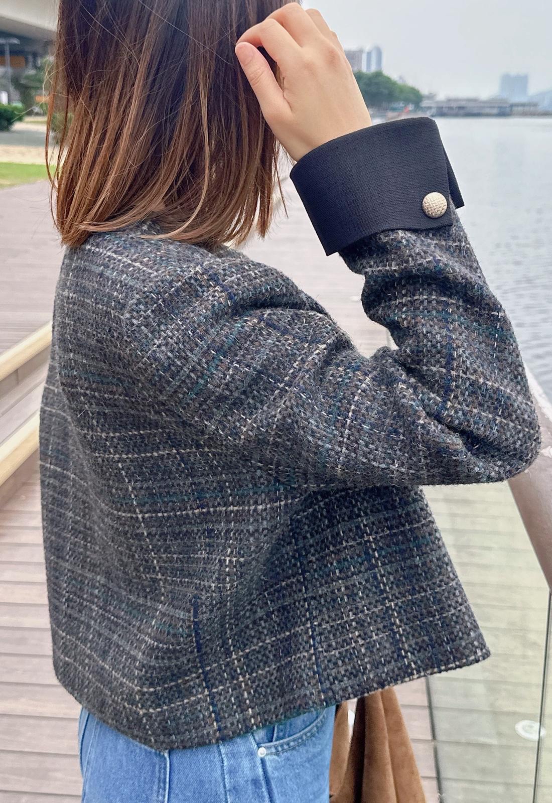 小香風格仔紋摺袖絨褸