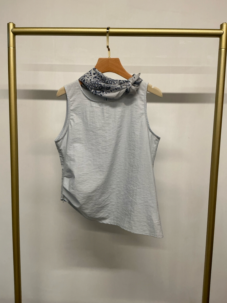 ## 淺藍色無袖背心上衣(戴絲巾) 這款淺藍色無袖背心上衣,以簡約的設計突顯優雅氣質,搭配一條精緻的絲巾,為您的造型增添一抹亮麗。這款上衣採用高品質的柔軟材質,提供舒適貼合的穿著體驗,適合各種場合。 **重點功能:** * **淺藍色:**經典百搭的顏色,適合各種膚色和風格。 * **無袖設計:**展現修長手臂線條,同時保持清爽舒適。 * **絲巾點綴:**增添一抹亮麗,為造型增添層次感。 * **高品質材質:**柔軟舒適,觸感細膩。 * **簡約設計:**易於搭配各種服飾,打造多種風格。 **這款淺藍色無袖背心上衣是您衣櫃不可或缺的單品,無論是休閒出遊、職場通勤,還是參加正式場合,都能輕鬆駕馭,展現自信魅力。**
